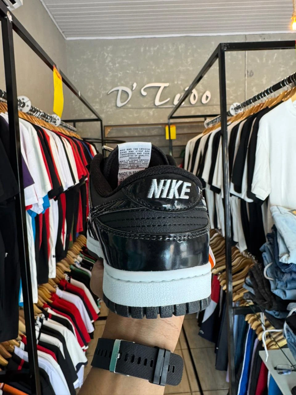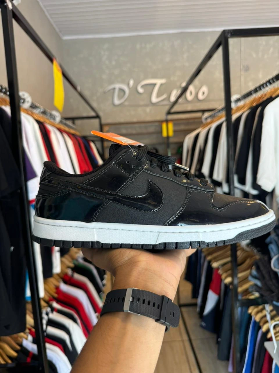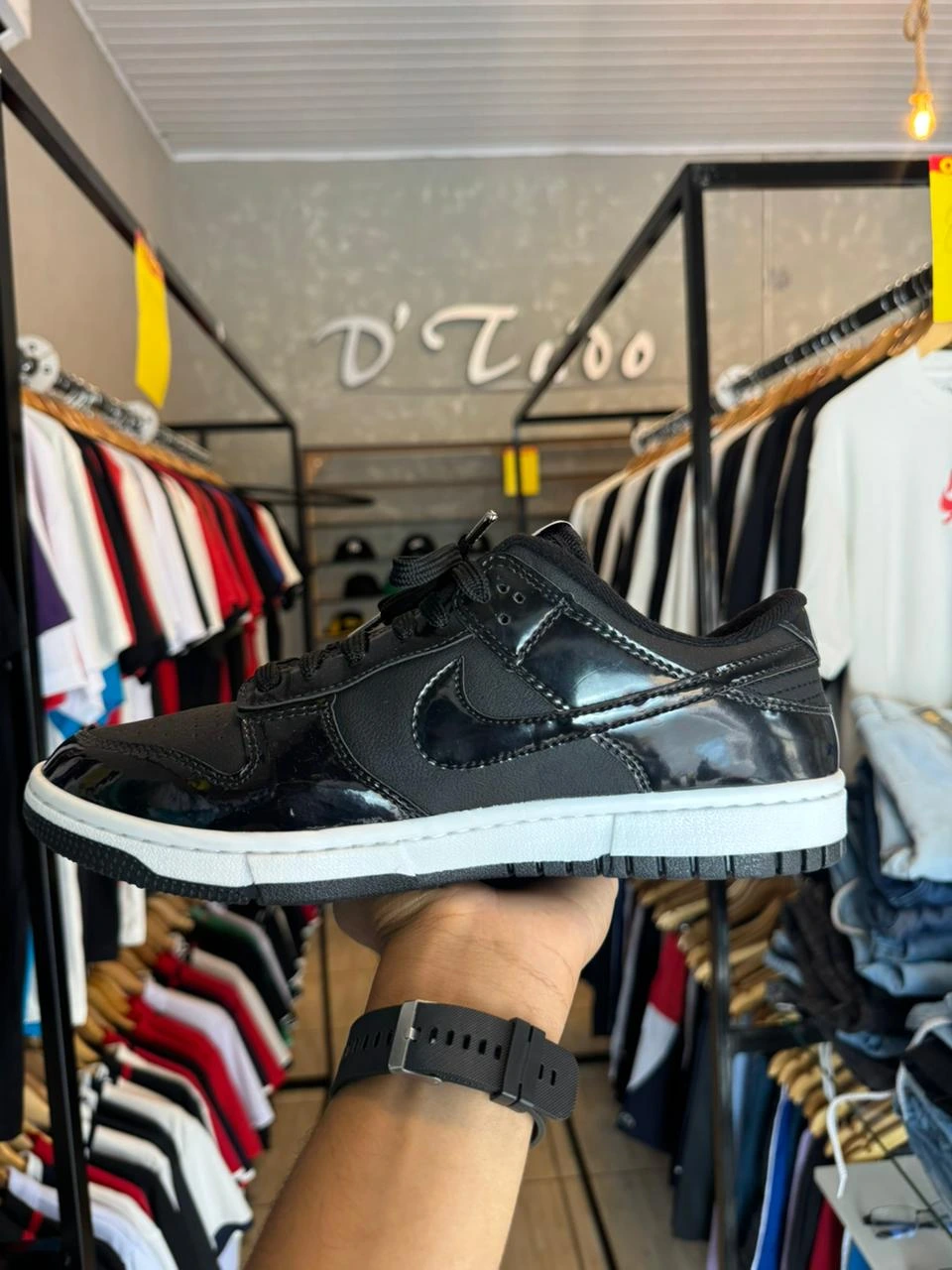 Com um mix matador de texturas, ele equilibra o couro fosco com sobreposições em *verniz (patent leather), dando aquele brilho premium que transforma qualquer *fit básico em algo de outro nível. É o tenis que transita entre o corre do dia a dia e o rolê mais selecionado à noite.